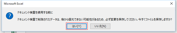 - ドキュメントの検査をする前に・・・と、表示が出ますので、「はい」をクリックしてファイルを保存します。