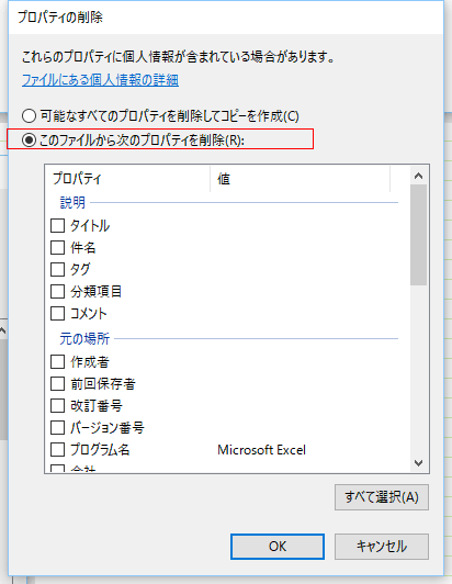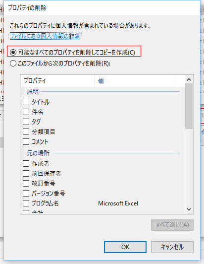 - 「可能なすべてのプロパティを削除してコピーを作成」にチェックを入れて、[OK]ボタンをクリックすると、プロパティが削除されたコピーファイルが作成できます。