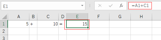 - 例えば、下図のように A1セルには 5、C1セルには 10 が入力されています。E1セルには=A1+C1 といった数式が入力されています。