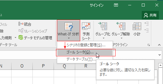 - [データ]タブの「What-If 分析」→「ゴールシーク」を選択します。