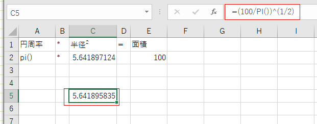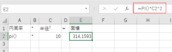 - 半径を C2セルに、面積を求める数式を E2セルに入力しています。数式は =PI()*C2^2 としました。