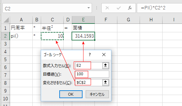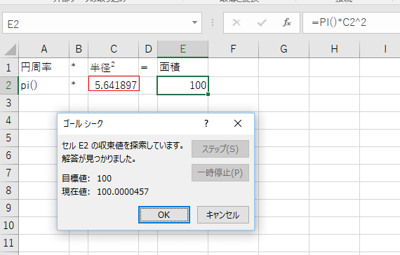 円の面積Sは S=円周率×(半径)*(半径) といった式で求められます。この数式のゴールシークを試してみます。