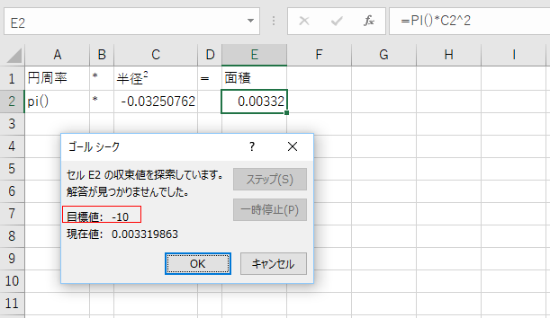 - 先ほどの面積の結果から半径を求めるとき、目標値を-10とした例です。