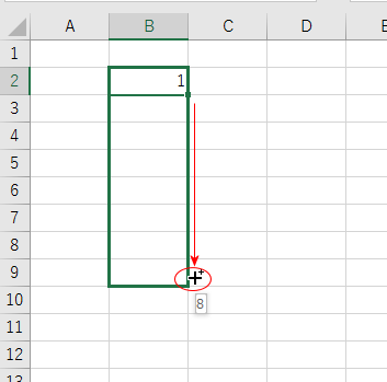 - 「1」と入力されているセルを選択して、フィルハンドルをドラグすると「1」がコピーされます。