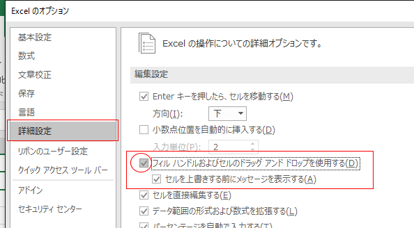 「フィルハンドルおよびセルのドラッグ アンド ドロップを使用する」のチェックが外れています。