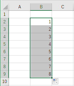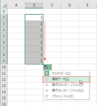 右下に表示されるオートフィルオプションをクリックして、「連続データ」を選択します。