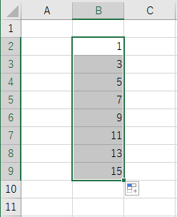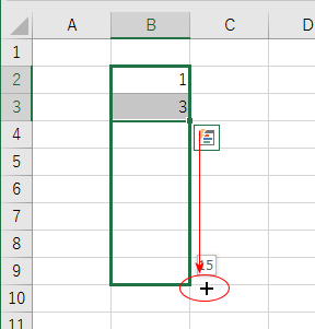 入力したB1:B2を選択して、フィルハンドルをドラッグします。(オートフィルします)