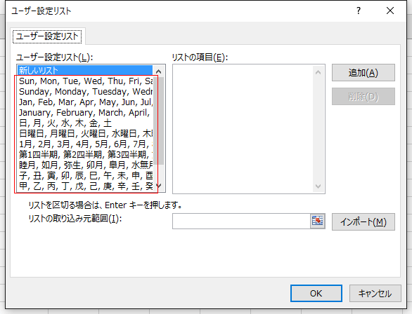 これらの連続値はユーザー設定リストに登録されています。ユーザーが独自に設定することもできますので、詳細は ユーザー設定のリストを使って連続データを入力する をご覧ください。