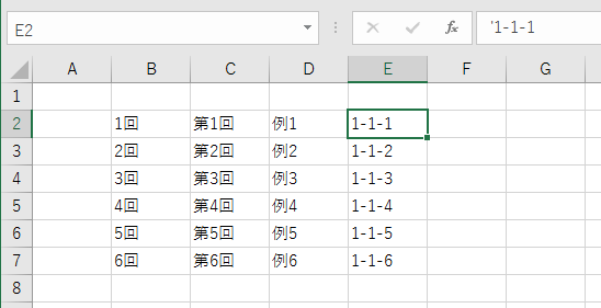 文字が複数含まれる文字列の場合は最後の数字が連続値になります。下図の1-1-1の例は 先頭にアポストロフィを入力して文字列にしたものです。
