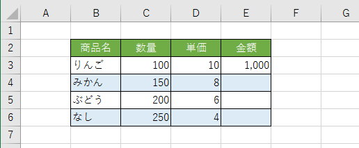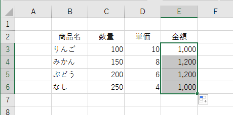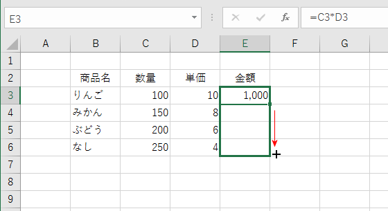 - E3セルに=C3*D3 と入力されています。 E3セルをE6セルまでオートフィルします。