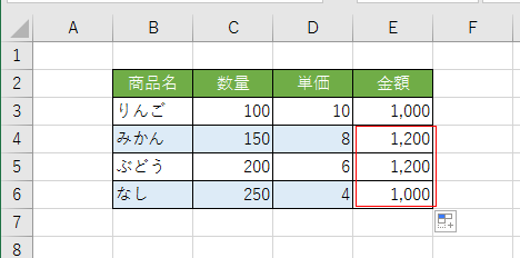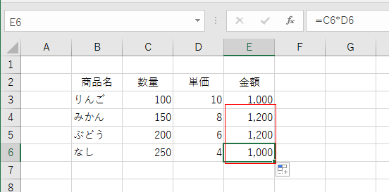 E4:E6に数式が入力されました。なお、E6の数式は =C6*D6 と正しいことが確認できます。