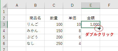 - E3セルを選択してフィルハンドルをダブルクリックします。