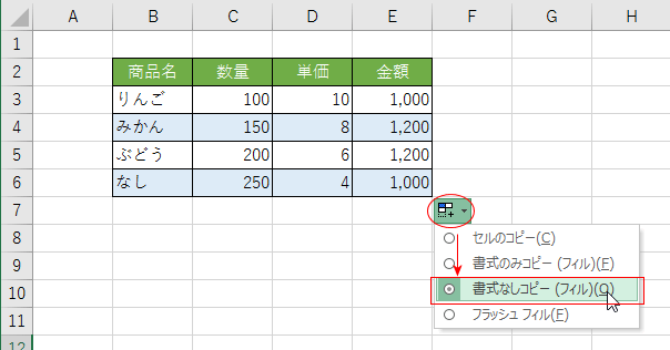 - オートフィルオプションをクリックして、「書式なしコピー(フィル)」を選択します。