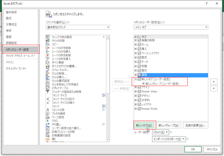 - 新しいタブをリボンにh逃避するには先頭のチェックボックスにチェックを入れる必要があります。
