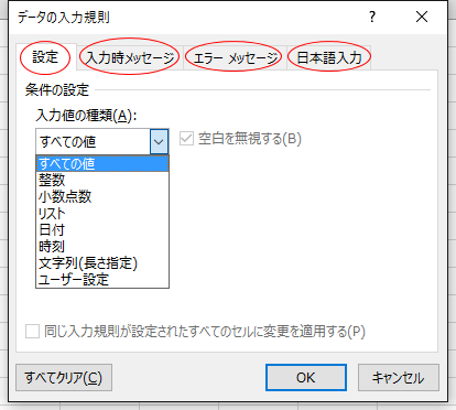 入力値を制限するための設定、入力するときにメッセージを表示する、制限した値以外の時に表示するエラーメッセージ、日本語入力(IME)を制御するといったことができます。