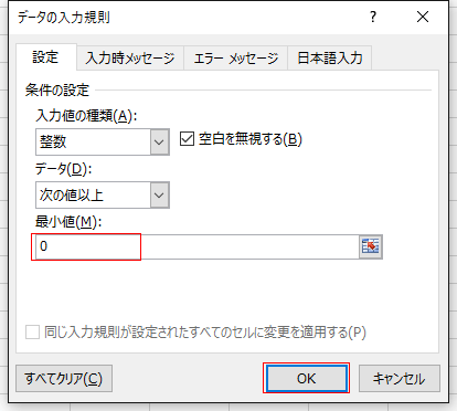 - 最小値に「0(ゼロ)」を入力しました。[OK]ボタンをクリックすると入力規則が設定されます。