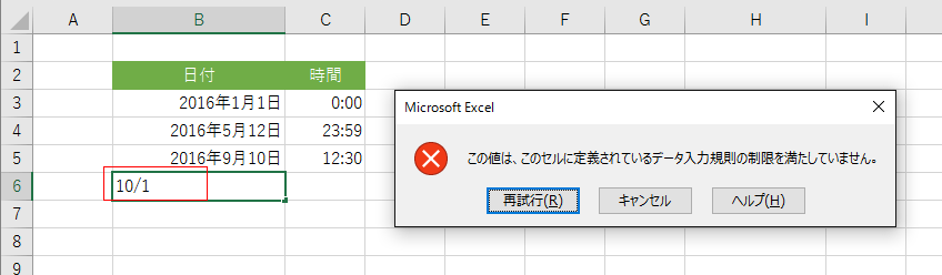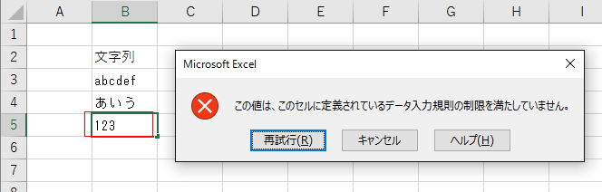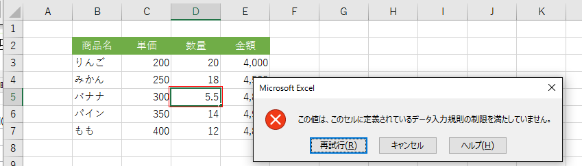 下図はD3セルに「5.5」と入力した状態です。「5.5」は設定した入力規則を満たさないので再試行して整数値を入れ直すか、入力をキャンセルすることになります。