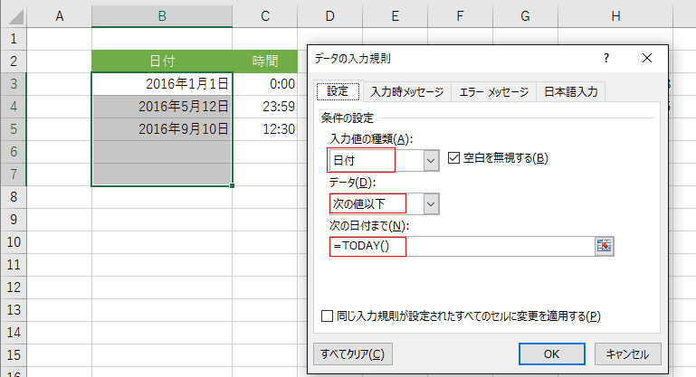 - 入力の種類で「日付」、データで「次の値以下」、次の日付までで「=TODY()」と設定しました。 =NOW()でもOKです。