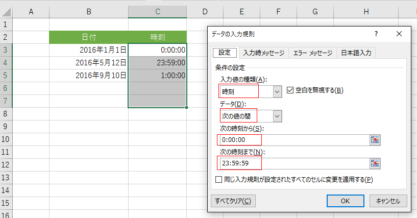 次の時刻からに「0:00:00」、次の時刻までに「23.59.59」としました。次項で説明するように「24:00」以上は入力できないためです。
