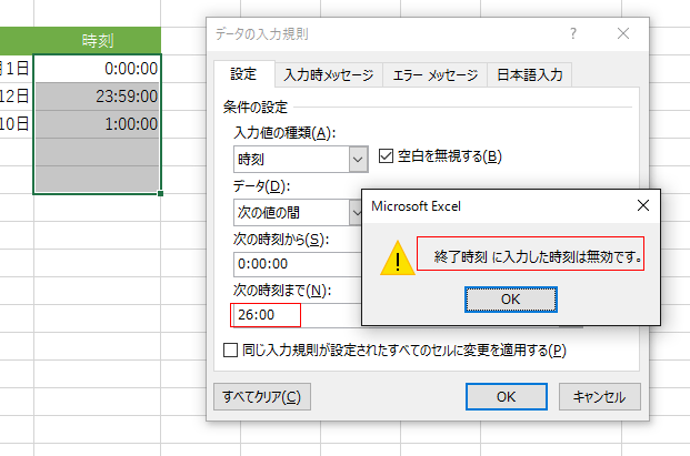 - 時刻で「次の値の間」を使うと 25:00 とか 26:00 といった24:00以上の値を設定することができません。