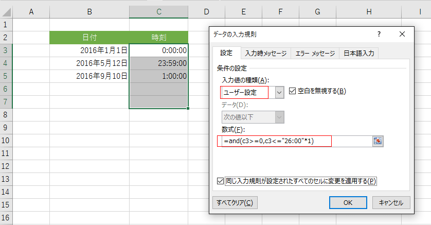 数式で =and(C3>=0,C3<="26:00"*1) と設定します。 選択しているセル範囲のアクティブセルがC3ですので、C3セルを使った数式で条件を作成します。