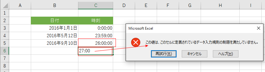 - 入力値の種類を「時刻」に設定すると、時刻データを制限することができます。