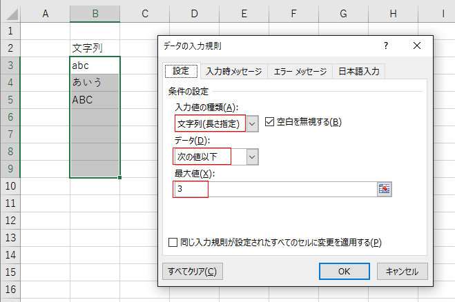 - 下図のように半角文字も全角文字も3文字以下に制限することができます。