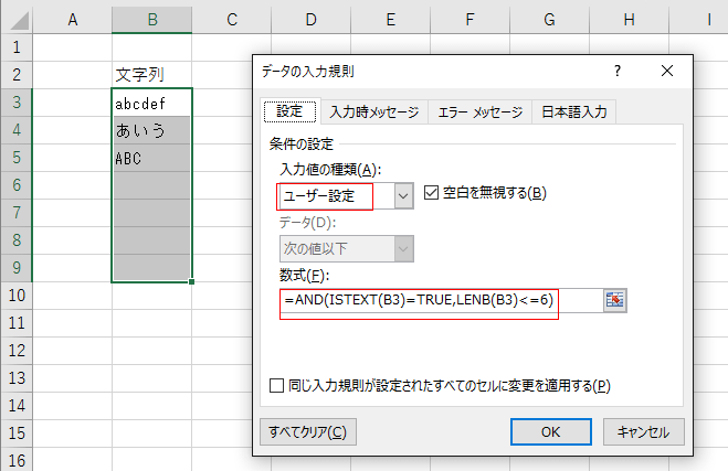 数式に「=AND(ISTEXT(B3)=TRUE,LENB(B3)<=6)」と入力しました。