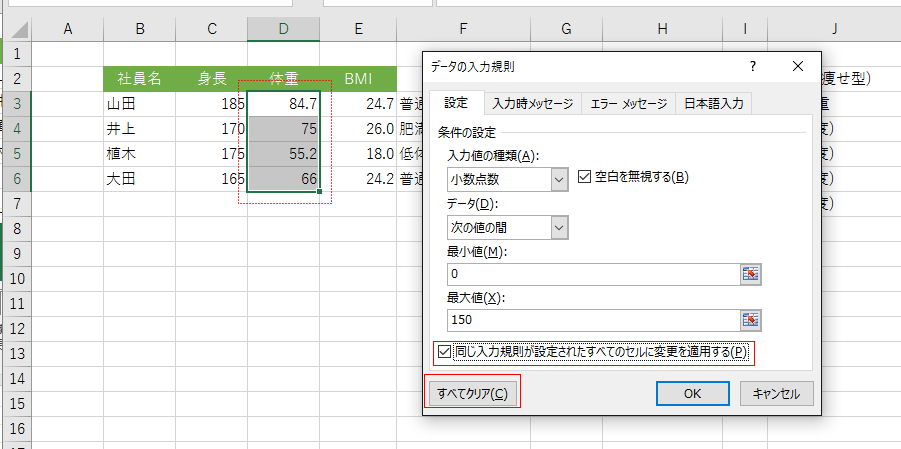 - 「同じ入力規則が設定されてすべてのセルに変更を適用する」のチェックボックスをオンにします。