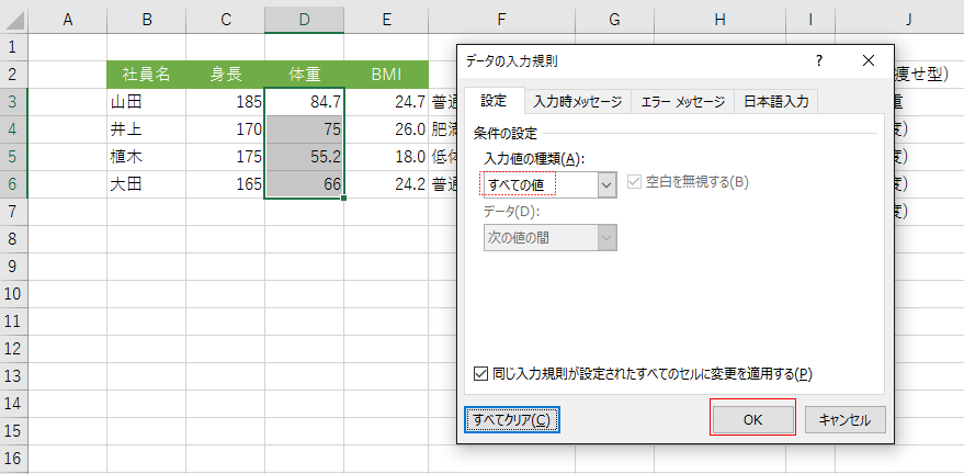 - 入力値の種類が「すべての値」に代わります。[OK]ボタンをクリアすると入力規則が解除されます。