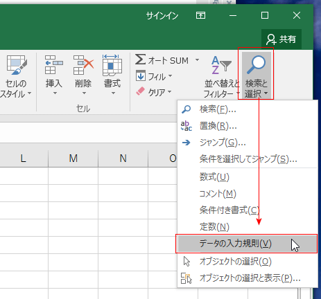 - 念のため、[ホーム]タブの[検索と選択]→[データの入力規則]を選択します。