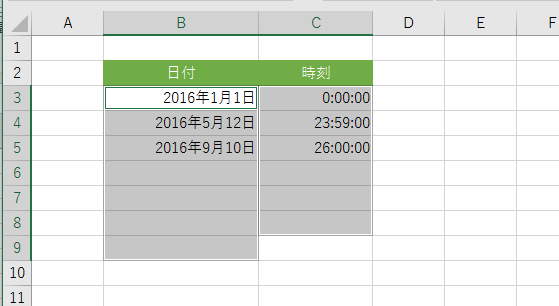 なお、下図のシートには日付と時刻の列に異なる入力規則が設定されています。