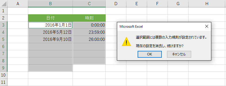 - 「選択範囲には複数の入力規則が設定されています。現在の設定を消去し、続けますか?」と表示されました。