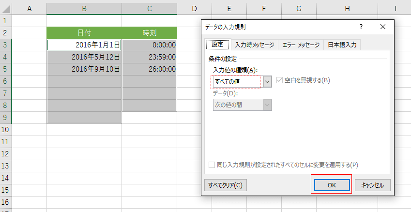 - 入力値の種類が「すべての値」となっているのを確認して、[OK]ボタンをクリックします。