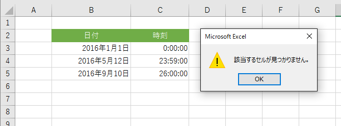 すると、「該当するセルが見つかりません」と表示されますので、入力規則がすべて解除されたことを確認することができます。