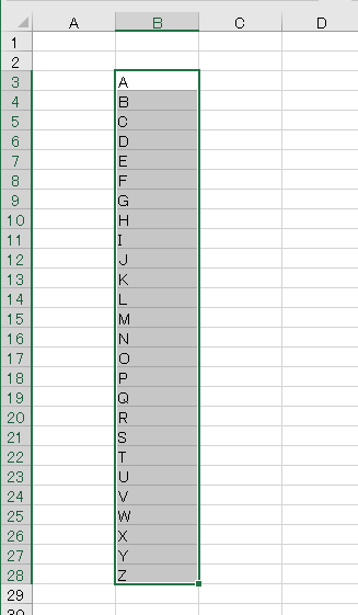 - シートに登録したい「A,B,C,D....X,Y,Z」 といった連続データを入力し、入力したセル範囲を選択します。
