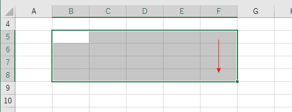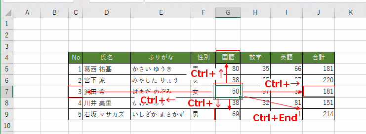 | Ctrl + ↓ | 下端のセル(下側に入力済みのセルがあるときはそのセル) |