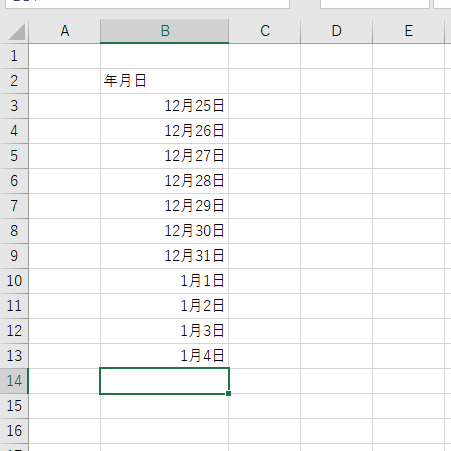 - ここの例では、B3セルに 12/25 と入力して、 12月25日と表示された後、オートフィルで 1月4日までの連続データを入力したものです。