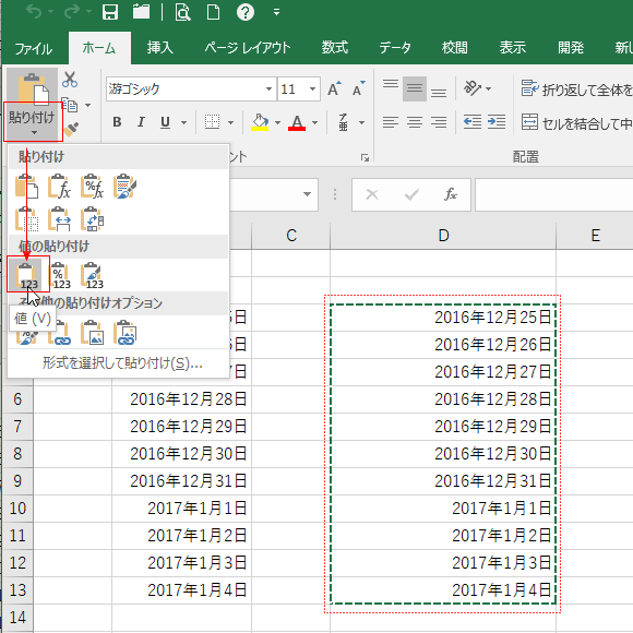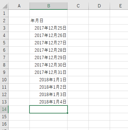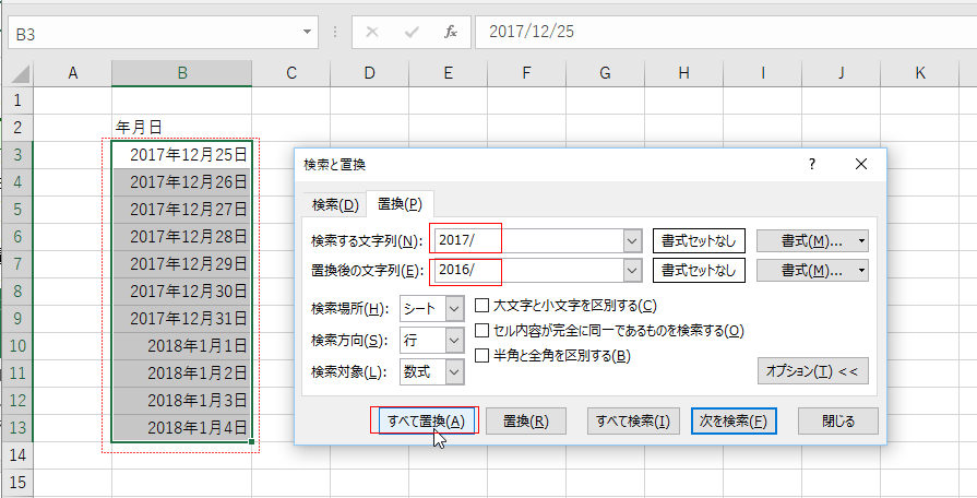 - 12月の日付を2016年に変更します。ここでのポイントは セルの値は 2017/12/25〜2018/1/4 といった形式になっているということです。