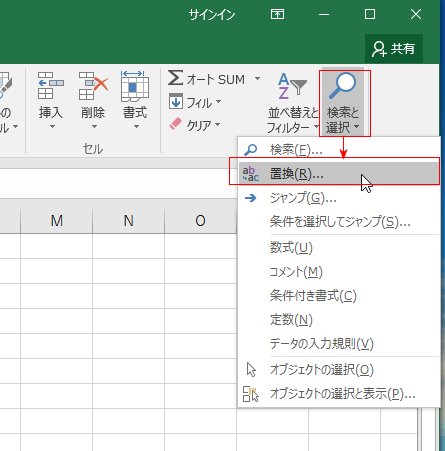 - [ホーム]タブの[検索と選択]→[置換]を実行します。