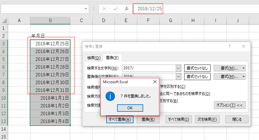 なお、数式バーを見ると 値は 2016/12/25 と変更されているのがわかります。
