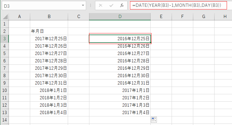 そういう時は、DATE関数を使って =DATE(YEAR(B3)-1,MONTH(B3),DAY(B3)) といった具合にして、前年の年に変更することができます。