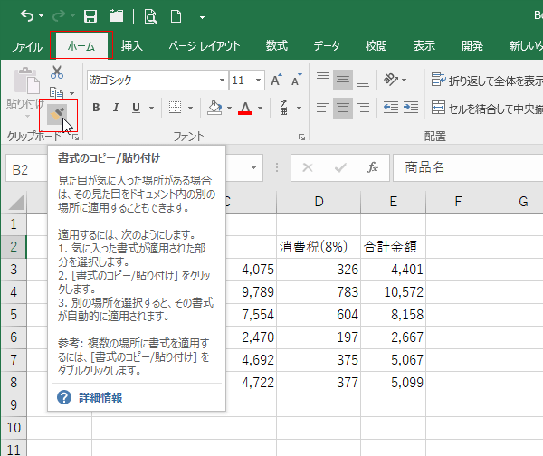 この機能は[ホーム]タブの[書式のコピー/貼り付け]から実行することができます。