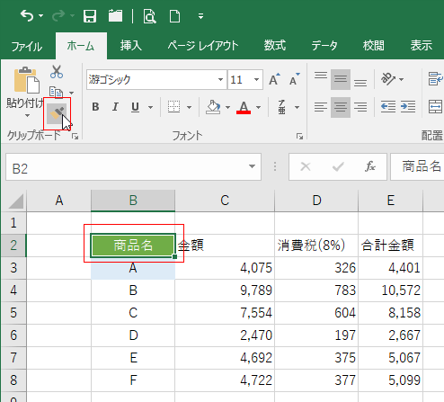 下図ではB2セルを選択して(アクティブにして)[書式のコピー/貼り付け]ボタンをクリックします。