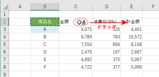 書式を貼り付けたいセルを選択します。ここでは C2セル〜E2セルに書式を張り付けたいのでドラッグしてセルを指定します。