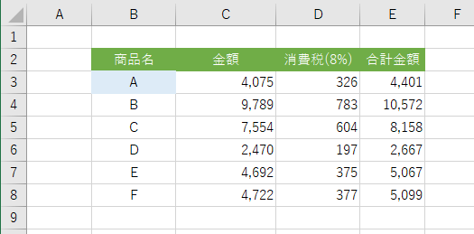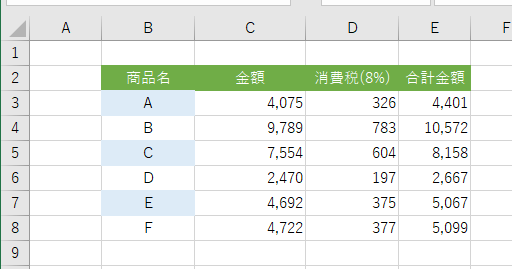 - B4:E4セルの書式をコピーし、、B6:E6セル、B8:E8セルに書式を貼り付けることができました。