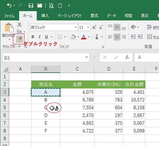 [書式のコピー/貼り付け]ボタンをダブルクリックします。