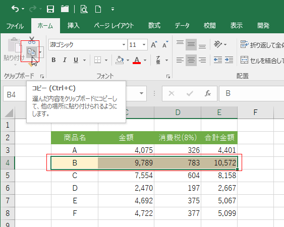 - B4:E4セルを選択して、[Ctrl]+[C]でコピーしました。