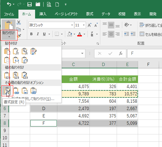 右下に表示された[貼り付けオプション]をクリックして、表示されたリストから[書式設定]を選択します。