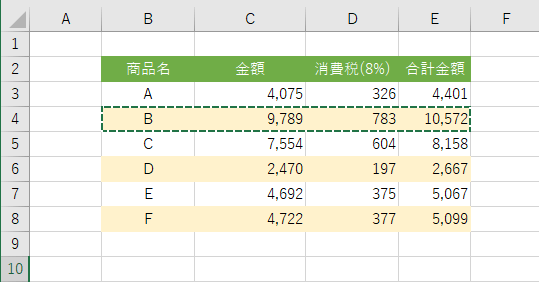 ここではB4:E4セルに設定してある書式を使いたいので、B4:E4セルを選択します。